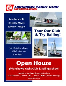 - 11:00 am – London-Fanshawe MPP Teresa Armstrong and other VIPs will take part in a ceremony recognizing an Ontario Trillium Foundation Grant which FYC received last year to repair part of the Main Dock, refreshments on the Main Dock (or in Doug MacKenzie Hall in case of Inclement Weather) and some Sailing for the visitors following this second ceremony – weather permitting.